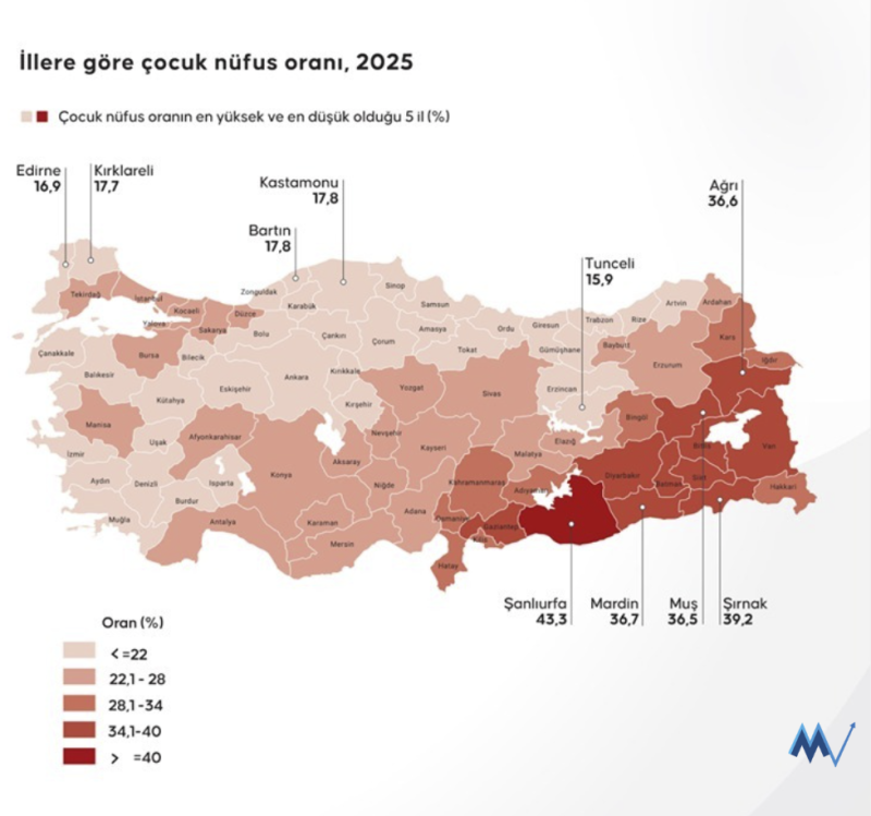 Adrese Dayalı Nüfus Kayıt Sistemi (ADNKS) sonuçlarına göre, geçen yıl en yüksek çocuk nüfus oranına sahip olan il, yüzde 43,3 ile Şanlıurfa oldu. Bunu, yüzde 39,2 ile Şırnak, yüzde 36,7 ile Mardin izledi. En düşük olduğu iller ise yüzde 15,9 ile Tunceli, yüzde 16,9 ile Edirne, yüzde 17,7 ile Kırklareli olarak belirlendi.