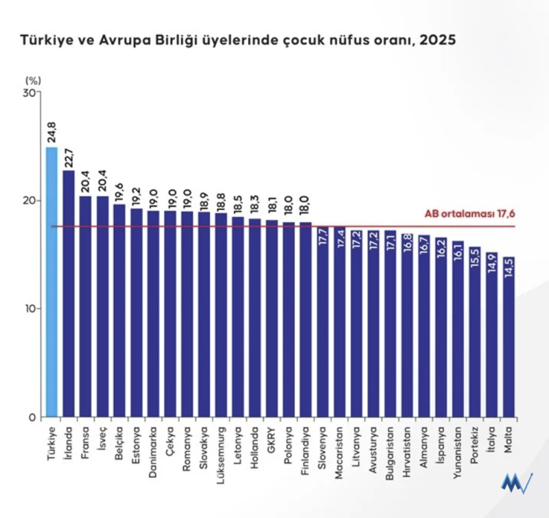 Avrupa Birliği (AB) üyesi 27 ülke incelendiğinde, 2025'te çocuk nüfus oranının AB ortalaması yüzde 17,6 olarak kayıtlara geçti. AB üyeleri arasında en fazla çocuk nüfus oranına sahip ülkeler, sırasıyla yüzde 22,7 ile İrlanda, yüzde 20,4'er ile Fransa ve İsveç olarak kaydedildi.