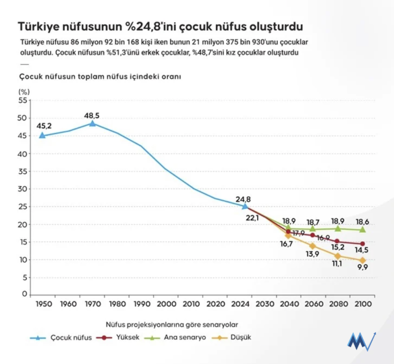 Nüfus projeksiyonlarına göre, çocuk nüfus oranının 2030'da yüzde 22,1, 2040'ta yüzde 17,9, 2060'ta yüzde 16,9, 2080'de yüzde 15,2 ve 2100'de yüzde 14,5 olacağı öngörüldü.